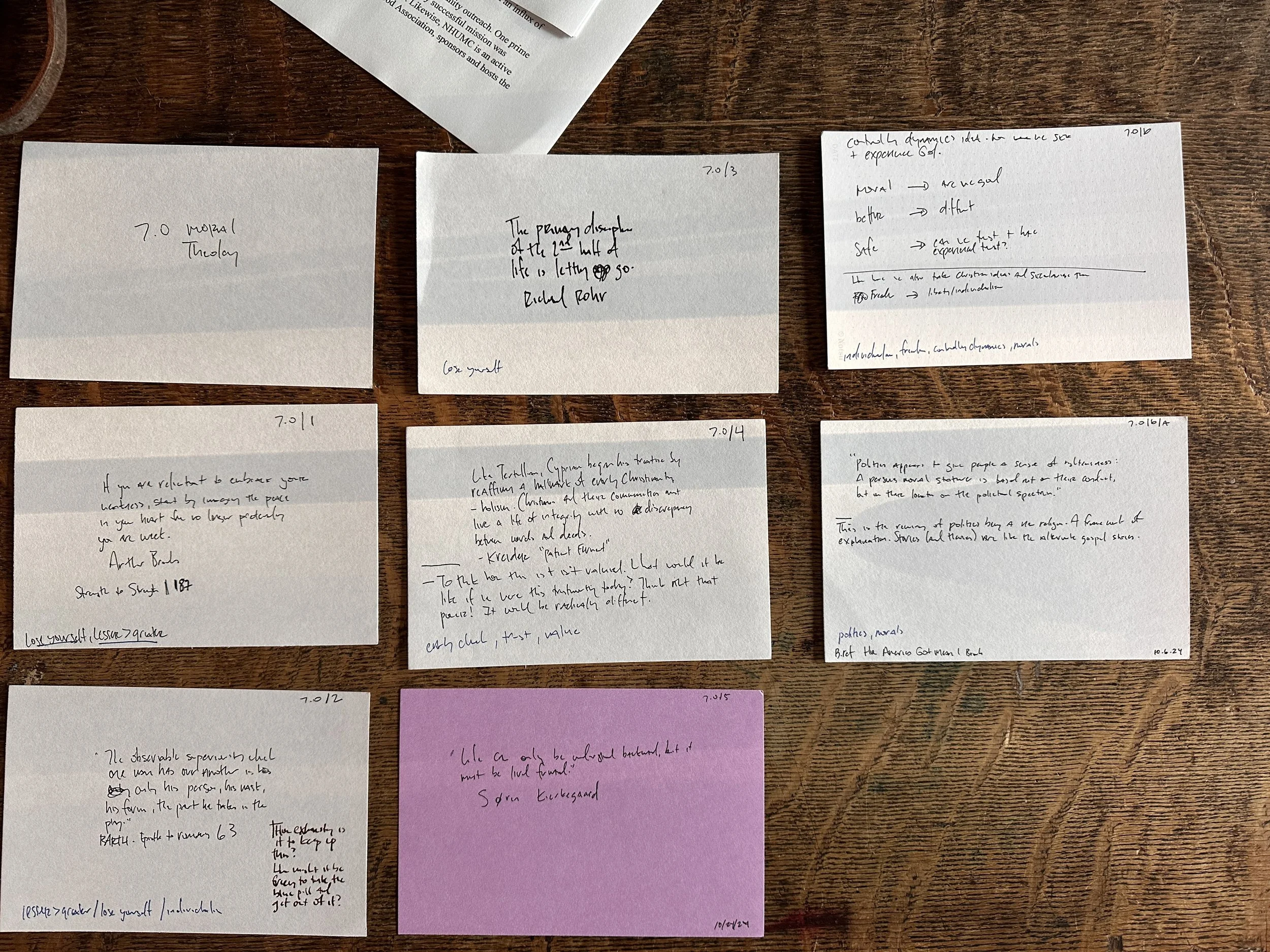 - Embracing the Index Card System: - Index cards are becoming my go-to tool for managing quotes, ideas, and important info. Inspired by methods like the Zettelkasten system, I’m archiving insights to revisit anytime. This switch has been a game-changer for prepping workshops and sermons.